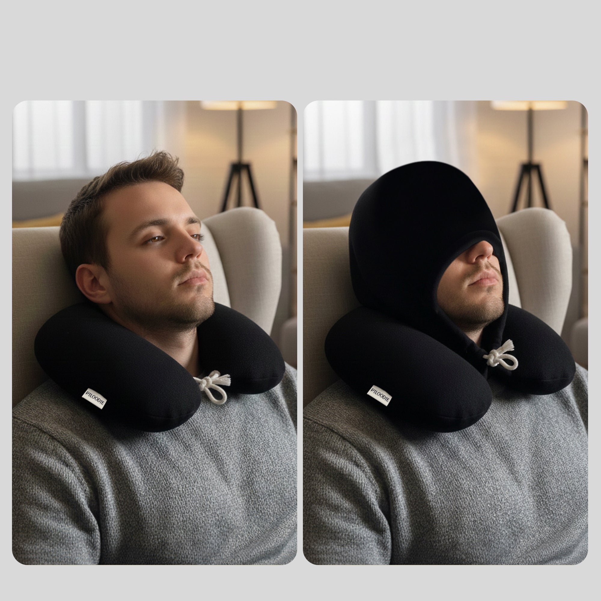 Andere Nackenkissen lassen Licht in die Augen. PILOODIE sorgt mit seinem Kapuzendesign dafür, dass du bis zu 90 % des Lichts blockierst – für Ruhe und Entspannung unterwegs.