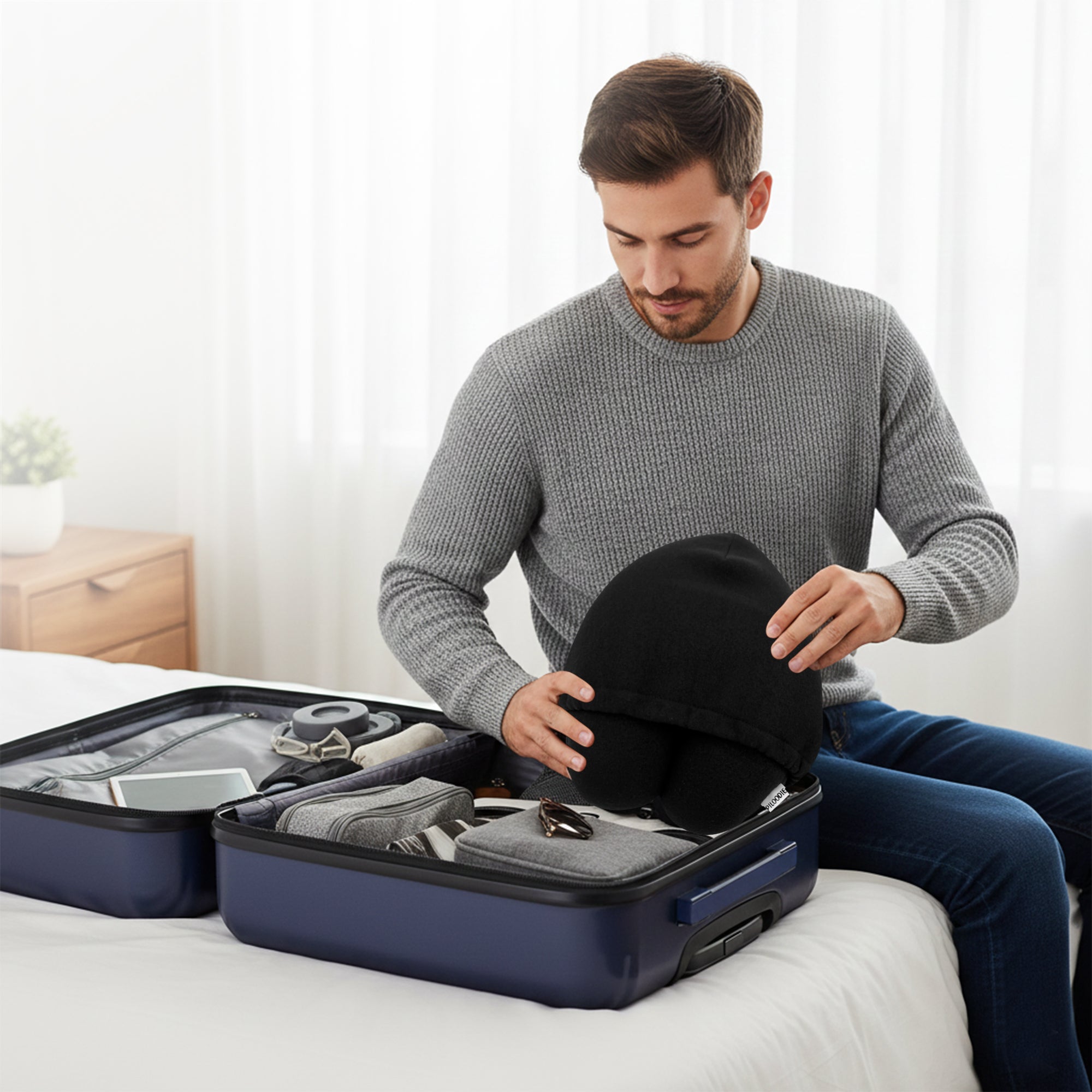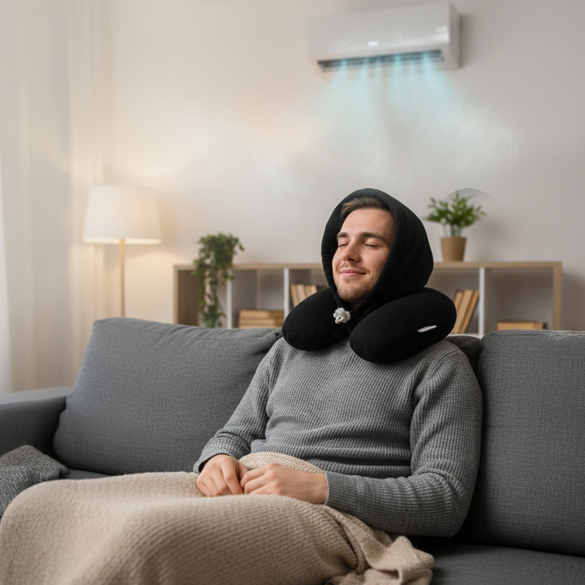 Einfach im Hoodie verstaut, immer dabei – dein Nackenkissen für entspanntes Reisen.